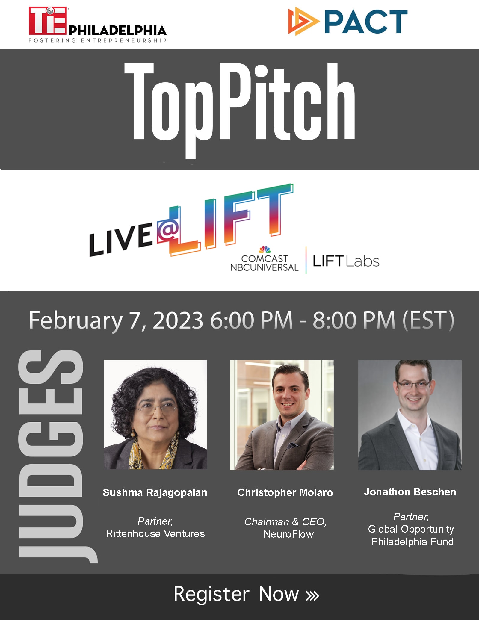 See five up-and-coming entrepreneurs pitch their innovations live to a panel of investors. Join PACT, TiE Philadelphia, and Comcast Lift Labs for this event, which also includes ample time for networking.